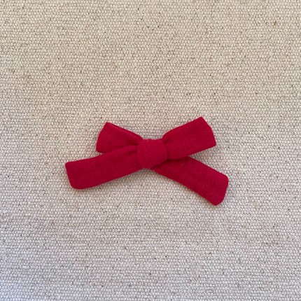 Le noeud est en gaze rouge , il mesure environ 8 cm .