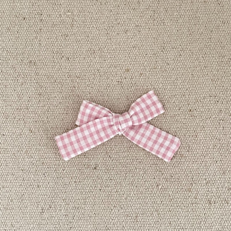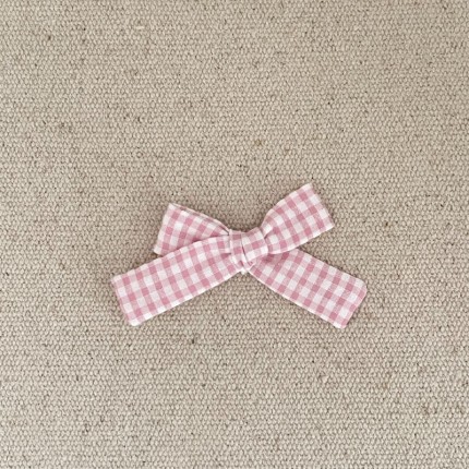 Le noeud est en coton vichy rose , il mesure environ 8 cm .