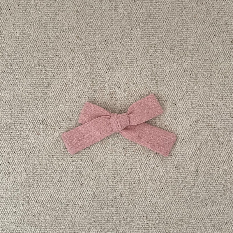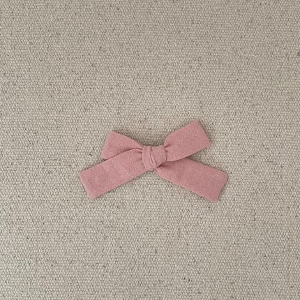 Le petit noeud est en coton lavé rose tendre , il mesure environ 8 cm .
