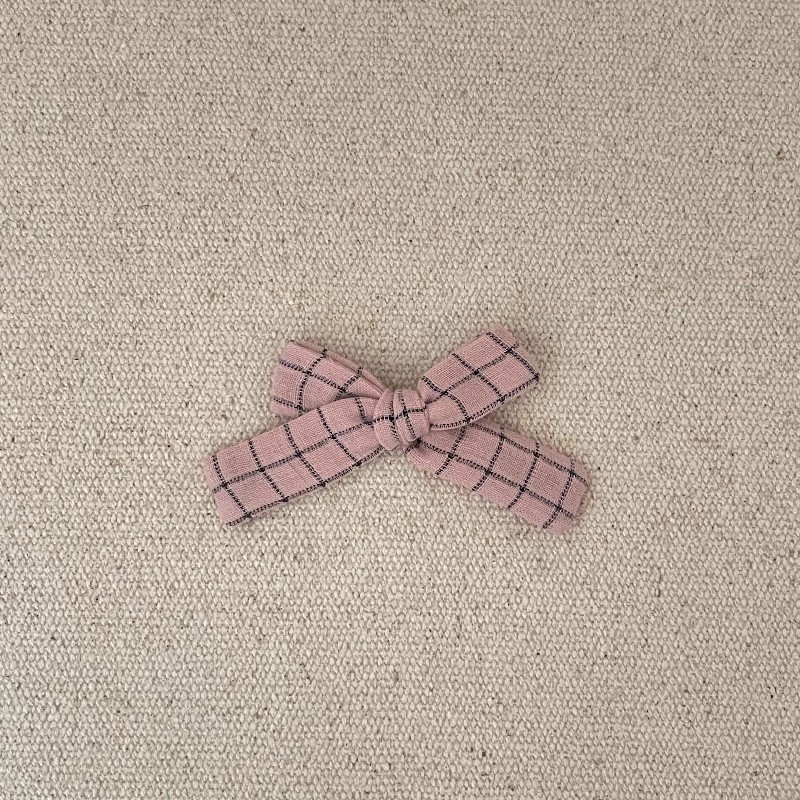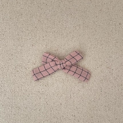 Le petit noeud est en gaze vichy rose tendre , il mesure environ 8 cm .