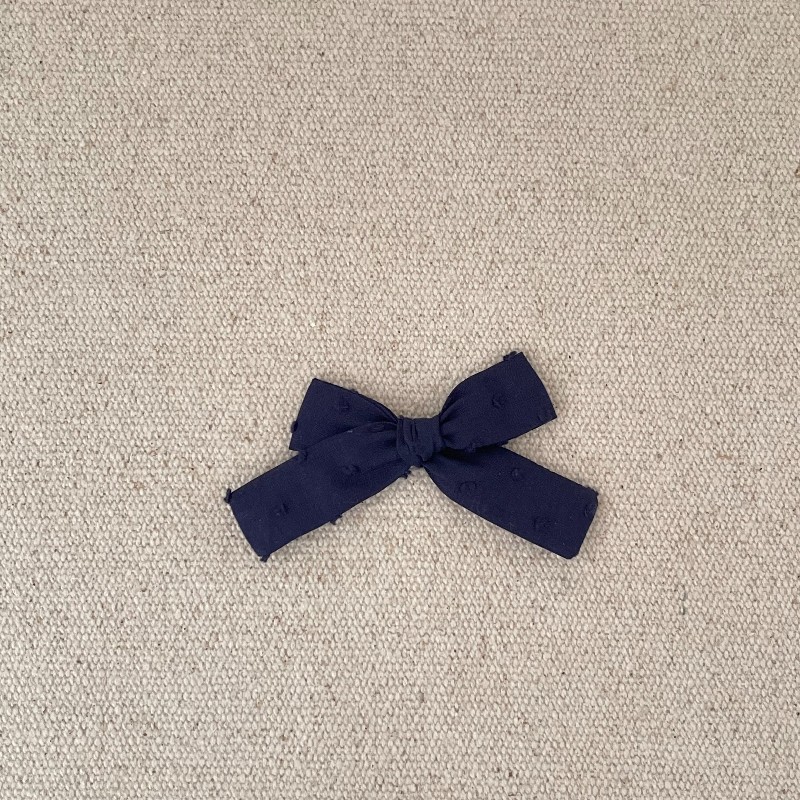 Le petit noeud est en plumetis de coton bleu marine , il mesure environ 8 cm .