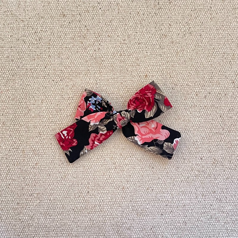 Le noeud est en coton noir avec des imprimés floraux , il mesure environ 9,5 cm .