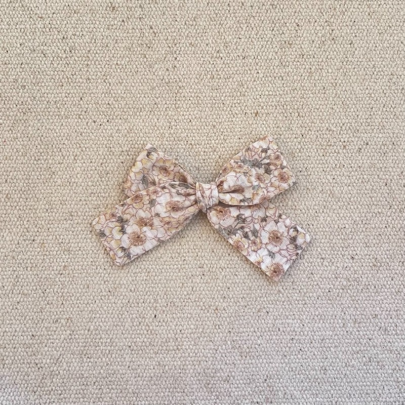 Le noeud est en gaze bio avec des petites fleurs , il mesure environ 9,5 cm .