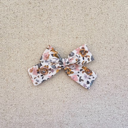 Le noeud est en gaze bio avec des petites fleurs , il mesure environ 9,5 cm .