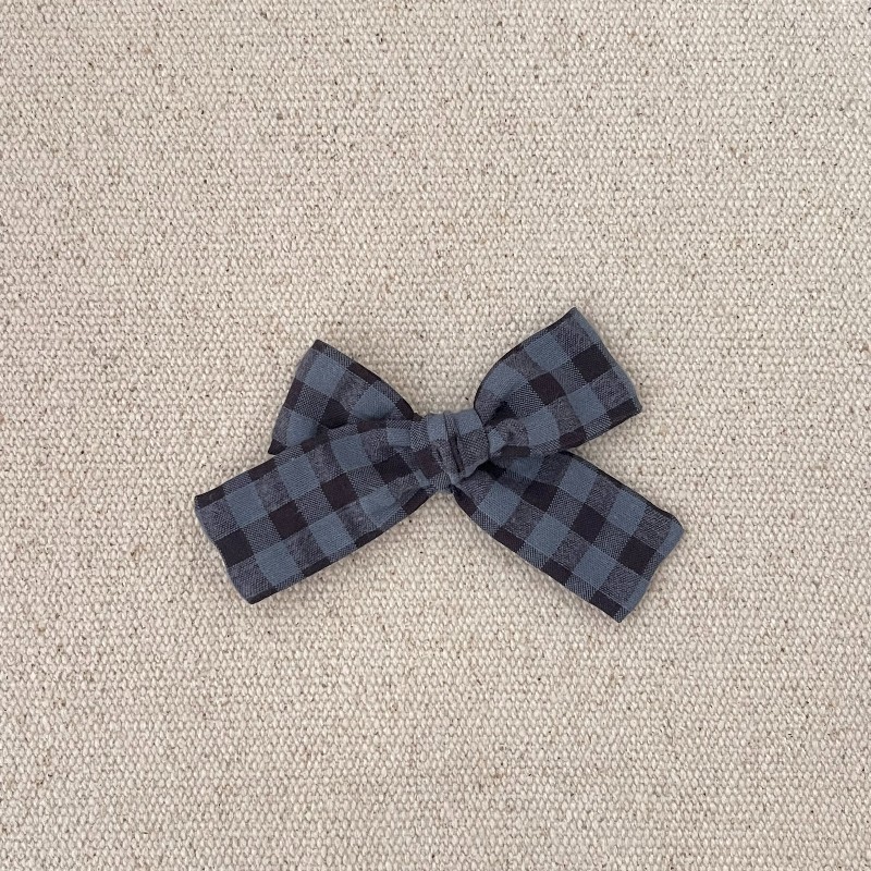 Le grand noeud est en coton vichy bleu jean , il mesure environ 9,5 cm .