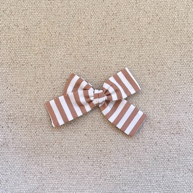 Le grand noeud est en coton rayé camel , il mesure environ 9,5 cm .