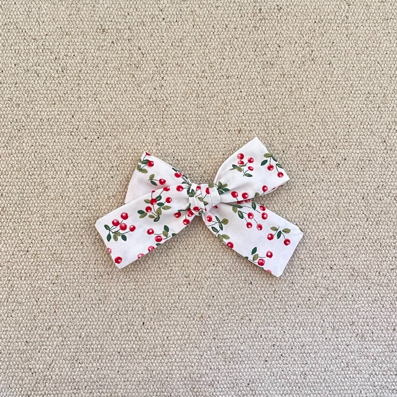 Le noeud est en coton avec des cerises , il mesure environ 9,5 cm .