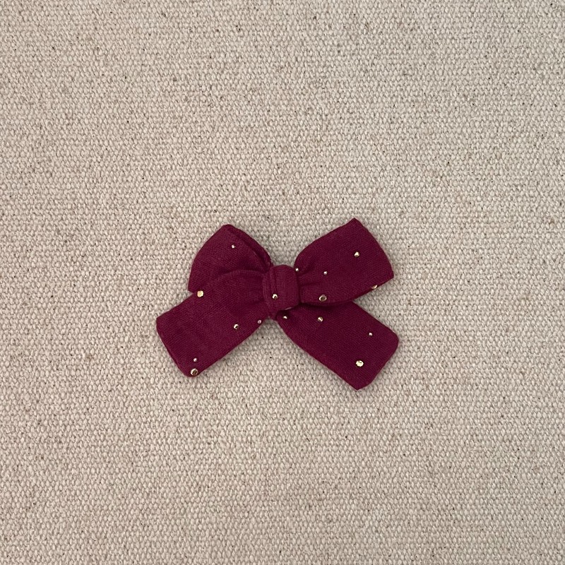 Le noeud antiglisse est en gaze de coton de couleur mûre à pois doré , il mesure environ 7 cm .