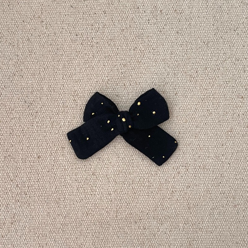 Le noeud antiglisse est en gaze de coton noir avec des pois doré , il mesure environ 7 cm .