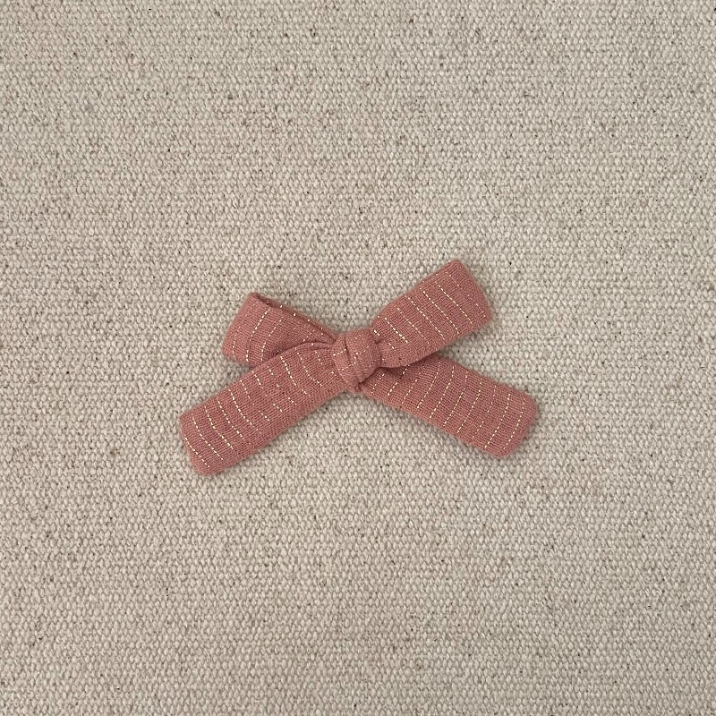 Le noeud noué est en gaze de coton nude avec des rayures liurex doré , il mesure environ 8 cm .