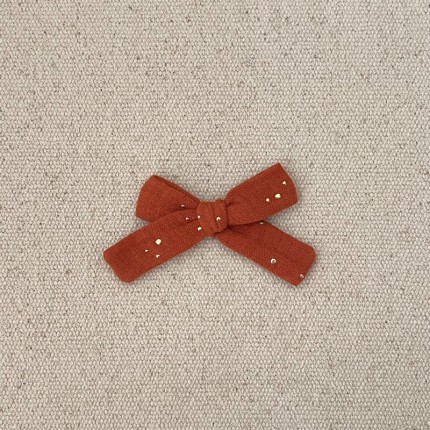 Le noeud noué est en gaze de coton terre cuite avec des pois doré , il mesure environ 8 cm .