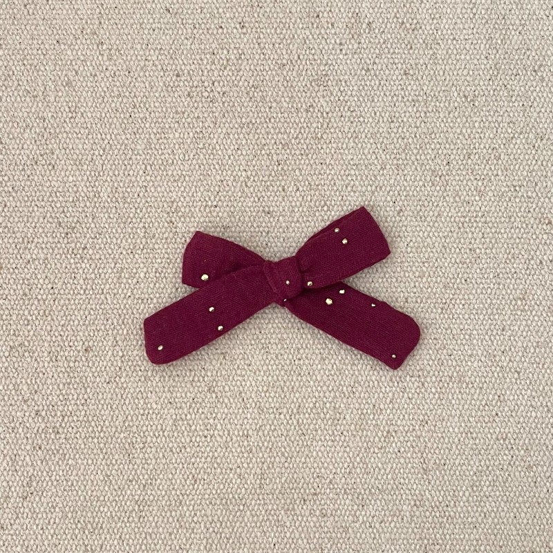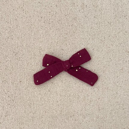 Le noeud noué est en gaze de coton de couleur mûre avec des pois doré , il mesure environ 8 cm .