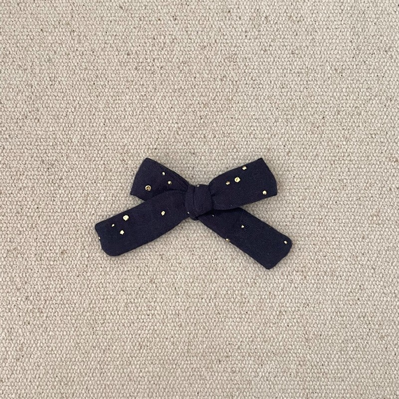 Le noeud noué est en gaze de coton bleu marine avec des pois doré , il mesure environ 8 cm .