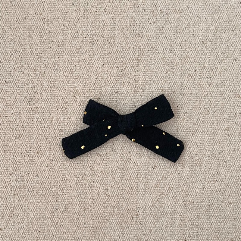 Le noeud noué est en gaze de coton noir avec des pois doré , il mesure environ 8 cm .