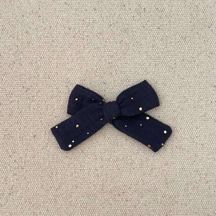 Le grand noeud est en gaze bleu marine à pois doré , il mesure environ 9,5 cm .