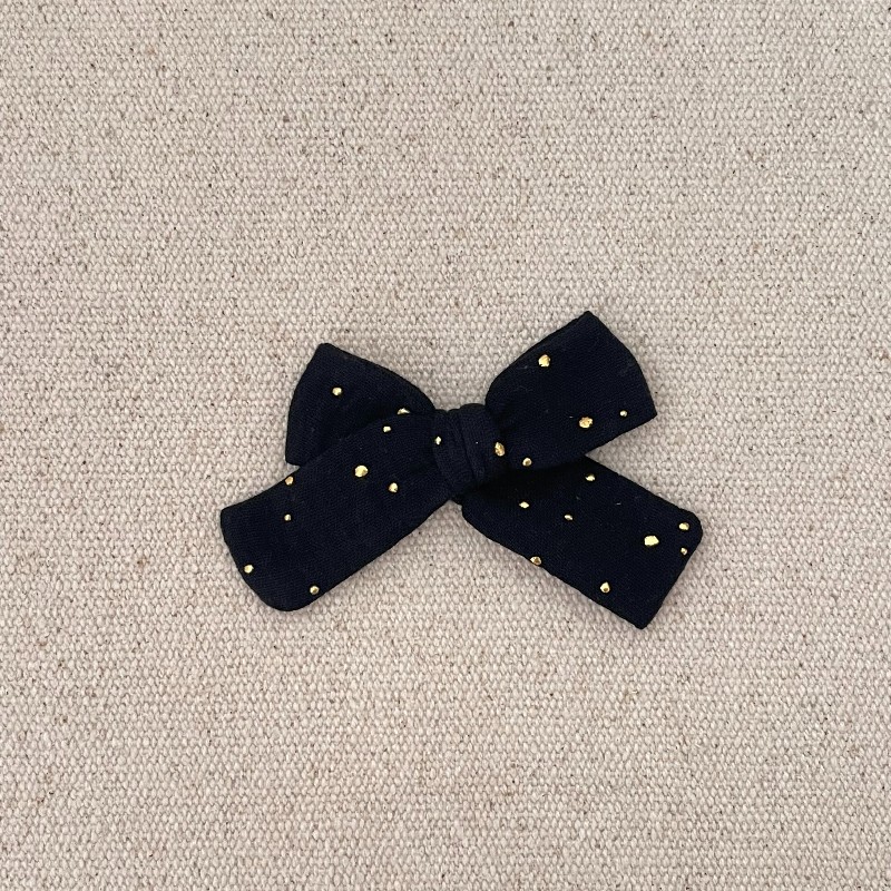 Le noeud antiglisse est en gaze de coton noir avec des pois doré , il mesure environ 7 cm .