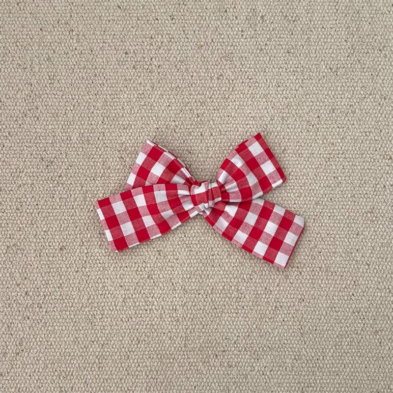Le grand noeud est en coton vichy rouge , il mesure environ 9,5 cm .