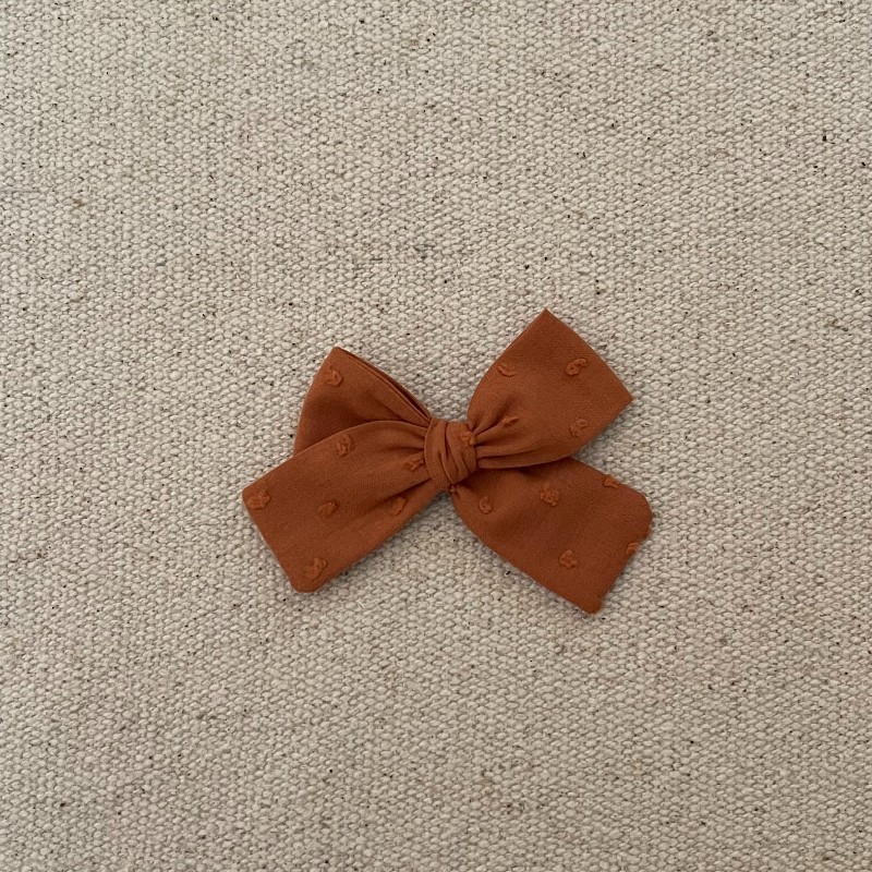 Le grand noeud est en gaze de couleur terre cuite à pois doré , il mesure environ 9,5 cm .