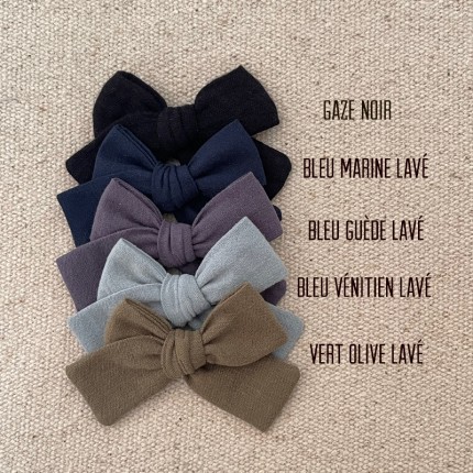 Sa pince doré rosé mesure 4 cm , le noeud est cousu dessus à la main .